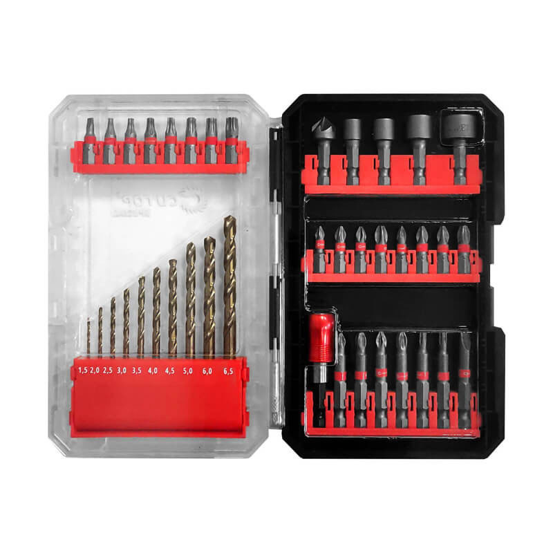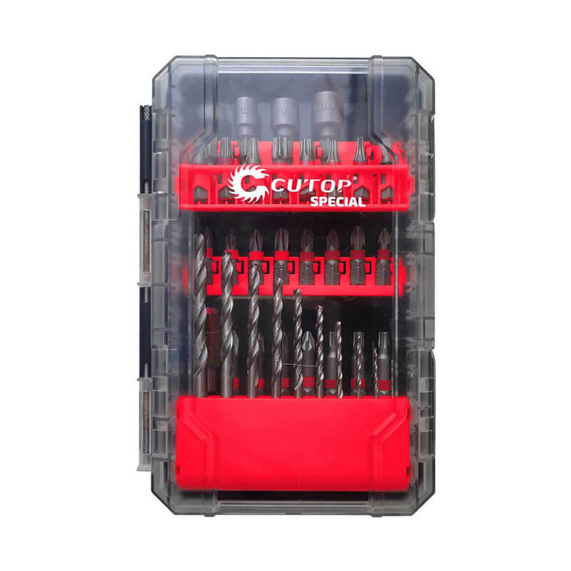 Накрайниците са изработени от висококачествена тайванска стомана S2. Свредлото е изработено от висококачествена HSS стомана. Предназначен за пробиване на отвори във въглеродни и легирани стомани, сив и сферографитен чугун, цветни метали и пластмаси. Комплектът е изработен по технологията Cutop.