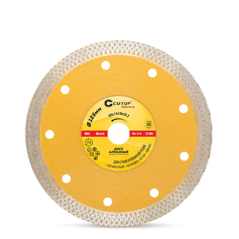 Височината на диамантения режещ слой е 10 мм, което позволява дискът да се използва за голям обем работа. Специалната форма на режещия ръб осигурява по-добро охлаждане на диска по време на работаза по-голяма ефективност при използване. Подсилване на диска в областта на монтажния отвор за увеличаване на твърдостта и намаляване на вибрациите.