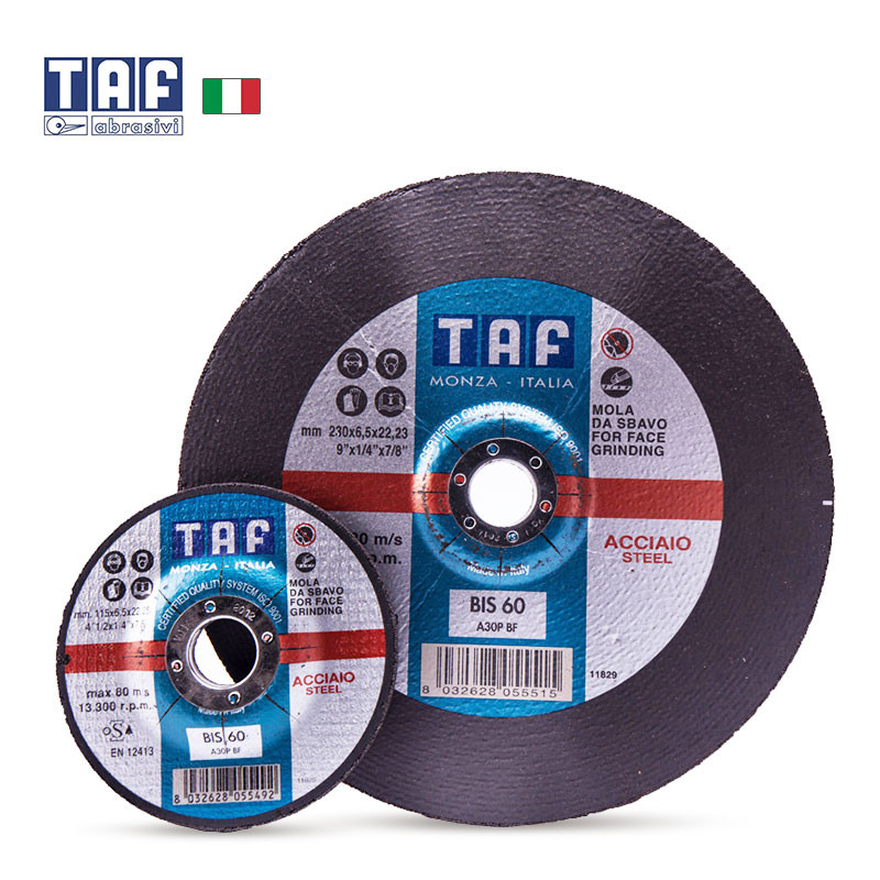 Универсалният шлайфащ диск на TAF - BIS60 е със средна твърдост, предназначен за обработка на стомана, неръждаема стомана, чугун и заварки. Осигурява добра скорост на отнемане на материал и стабилна работа при продължително натоварване. Формулата с ниско съдържание на Fe, S и Cl (< 0,1 %) предотвратява замърсяване на неръждаемите повърхности.
