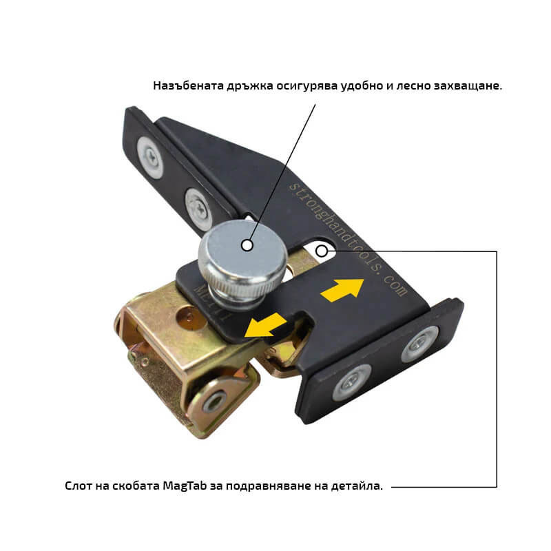 * Премахнете скобата MagTab, за да използвате регулируемата магнитна V-образна подложка за леко натоварване на стоманени плочи.