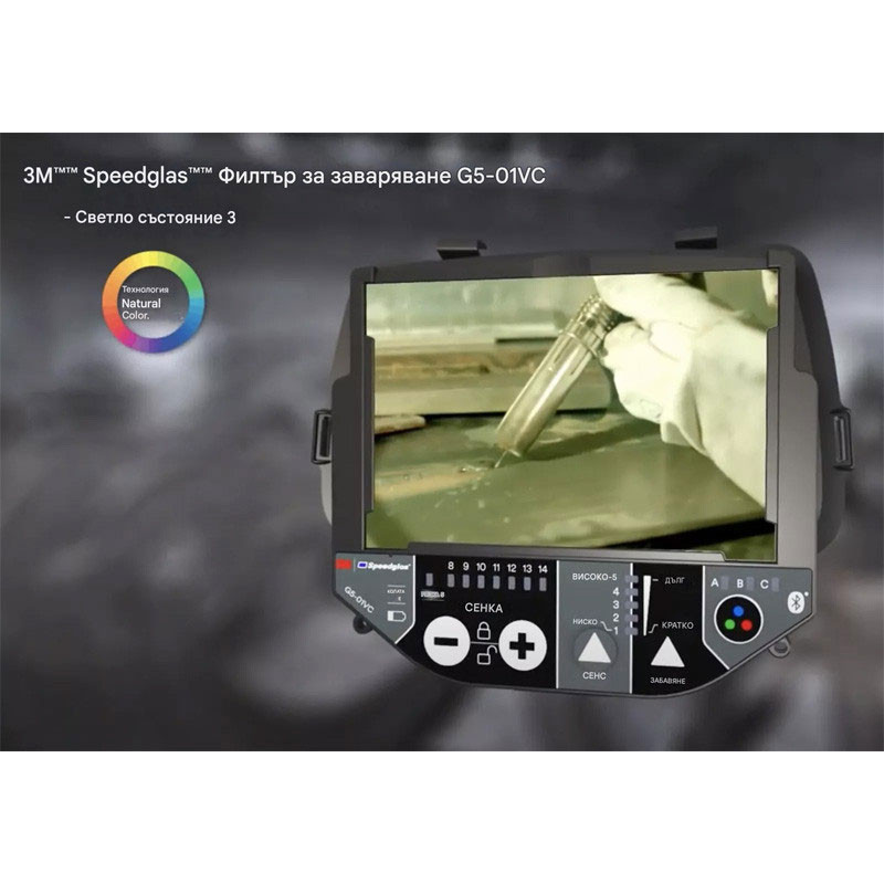 Заваръчният филтър 3M™ Speedglas™ G5-01VC предлага променливи тъмни нюанси 5, 8-14 плюс технология за променлив цвят.