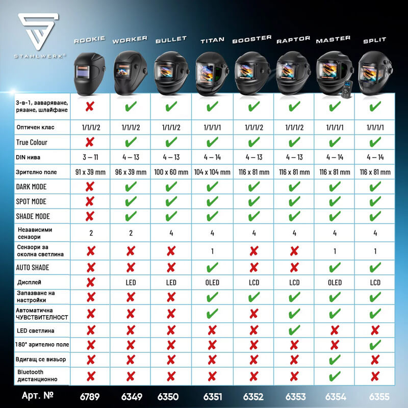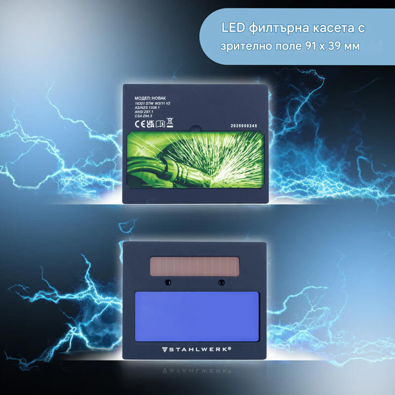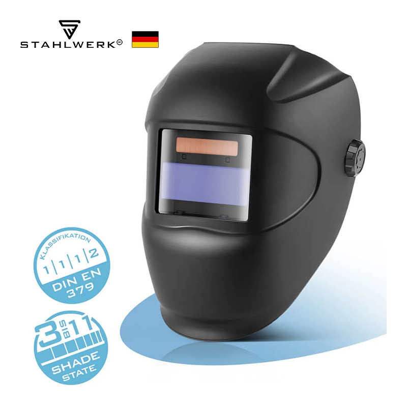 Здравата автоматична заваръчна маска ROOKIE на Stahlwerk с оптични класове 1/1/1/2 е идеална за прости заваръчни работи, плазмено рязане, както и за шлайфане и рязане. Заваръчната маска надеждно предпазва очите и лицето от вредни светкавици, топлина, искри и високоскоростни частици. Оборудвана с потъмняваща филтърна касета, заваръчната маска осигурява оптимална видимост и отлична защита. Два независими сензора гарантират, че заваръчният щит се затъмнява автоматично веднага щом дъгата се запали. Зрителното поле на филтърната касета е 91 x 39 мм, така че да имате оптимален преглед на работната зона и детайла по всяко време. Заваръчната маска предлага и достатъчно място за носене на респираторна маска или предпазни очила. Благодарение на многобройните опции за регулиране, лентата за глава на заваръчната каска се адаптира перфектно към формата на главата и предлага перфектно прилягане. Особено лекият дизайн на заваръчната маска обещава високо ниво на комфорт, дори при по-дълги работни цикли. Проектирана за ежедневна употреба, напълно автоматичната заваръчна маска е особено подходяща като лични предпазни средства (ЛПС) в промишлеността, търговията и „Направи си сам“.