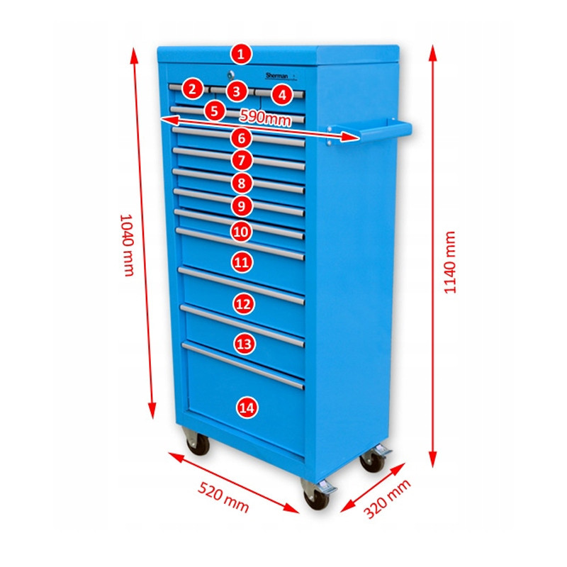 Стоманена количка с 13 изтеглящи се чекмеджета и ролкови лагери.