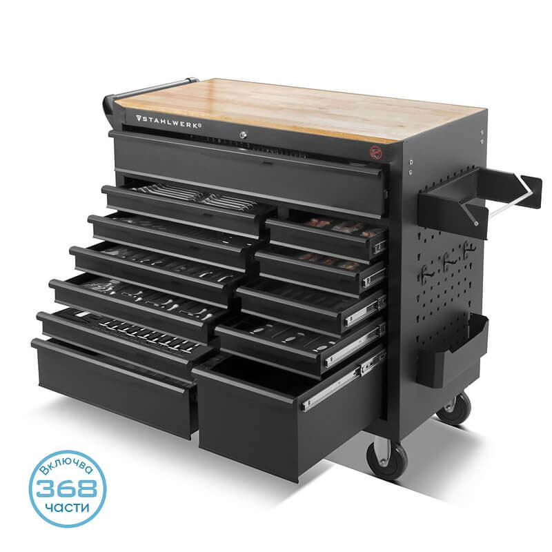 Количката STAHLWERK DINO предлага широка гама от 368 първокласни инструмента, изработени от хром-ванадий, идеални за професионалисти в промишлеността, сервизите и DIY ("Направи си сам").