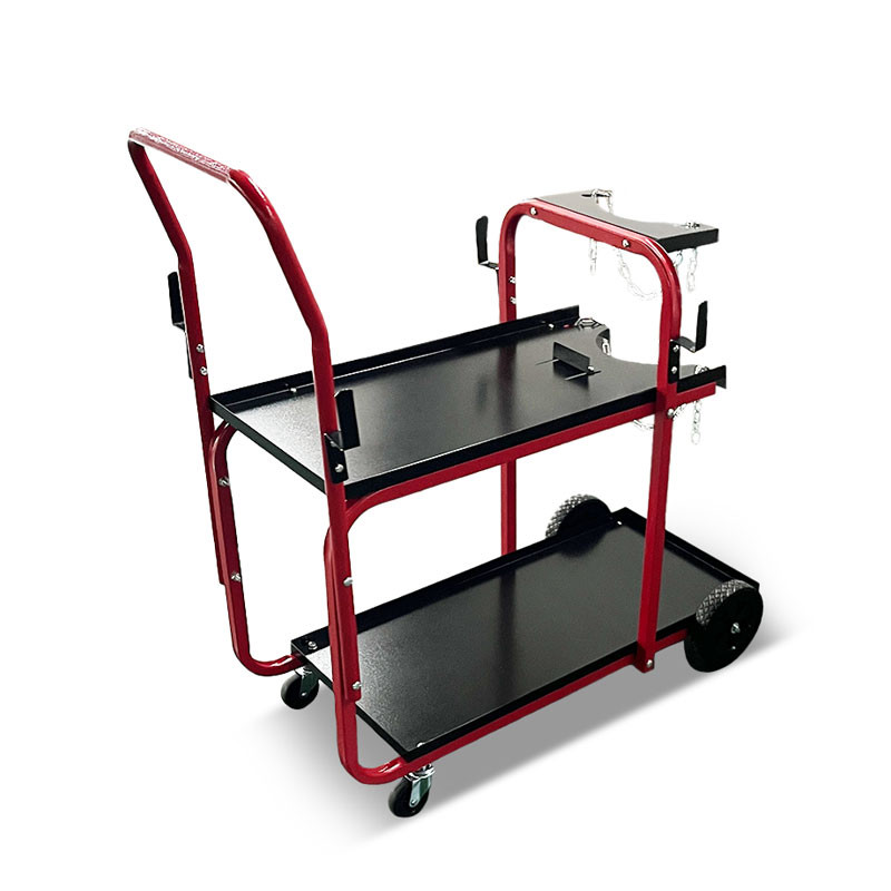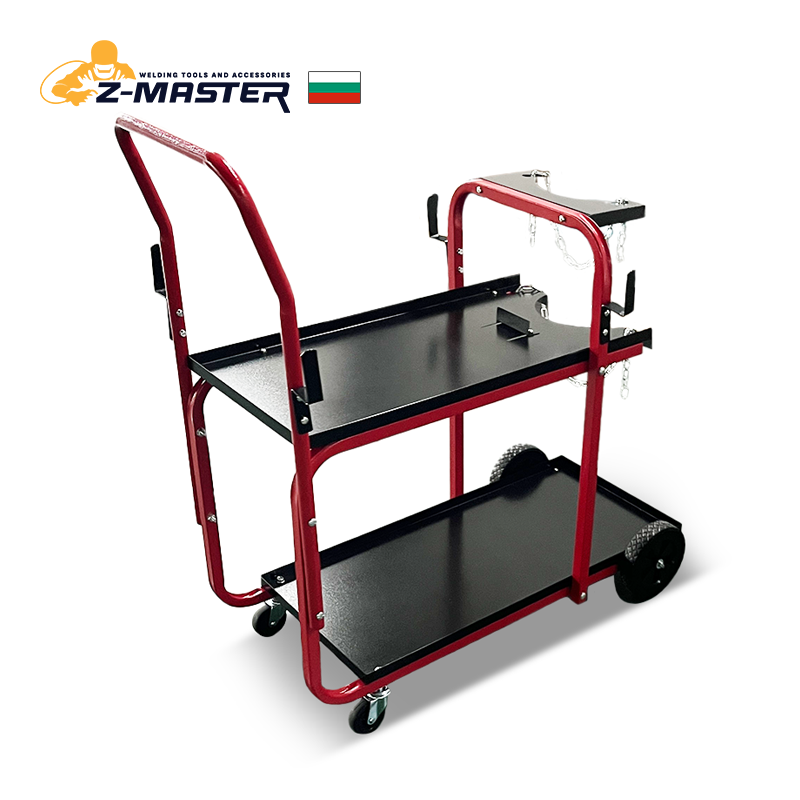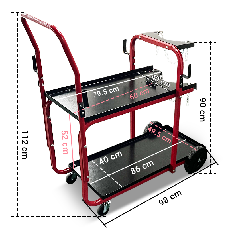 Тази количка е проектирана за по-сериозни натоварвания и професионална употреба. Със своите размери 105 x 50 x 111 см и подсилена конструкция (1 мм стомана), тя може да побере по-големи заваръчни апарати и газови бутилки.