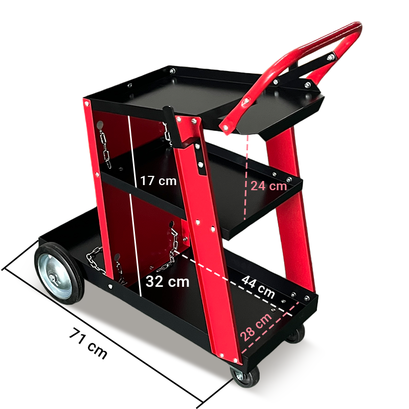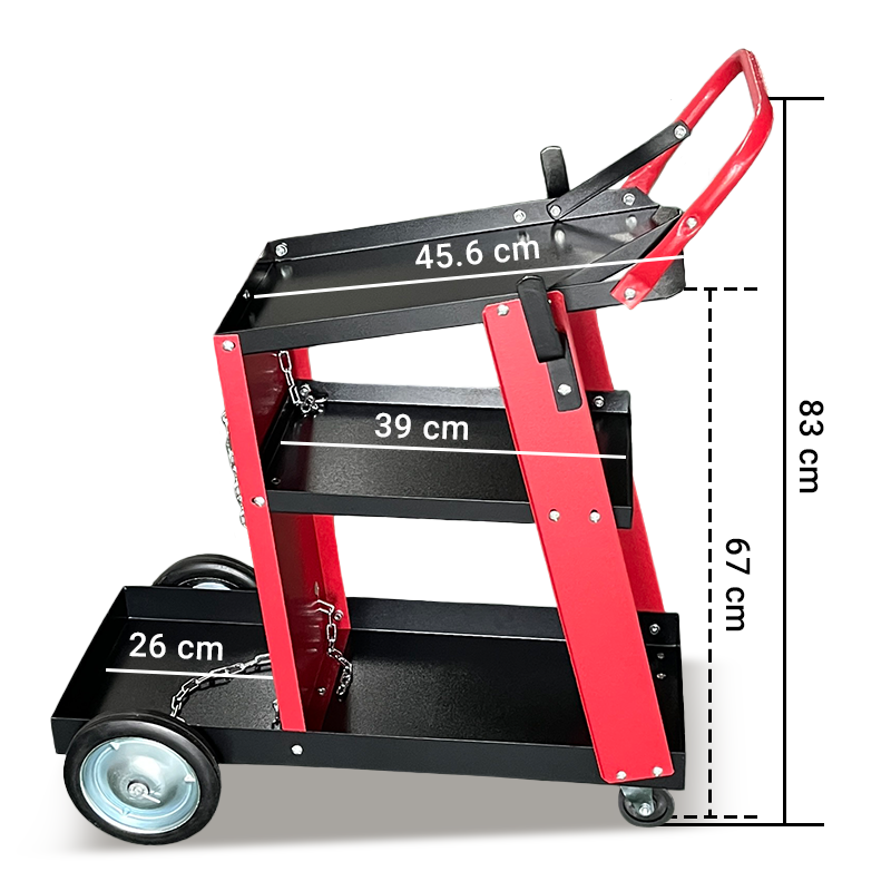 Здрава и компактна заваръчна количка, проектирана за удобно транспортиране на заваръчен апарат и газова бутилка. Металната конструкция с дебелина 1 мм гарантира стабилност и надеждност при работа. Благодарение на включената верига бутилката се фиксира сигурно, а сгъваемата дръжка улеснява маневреността.
