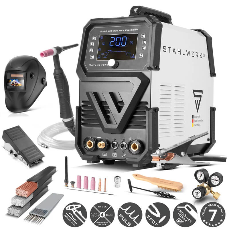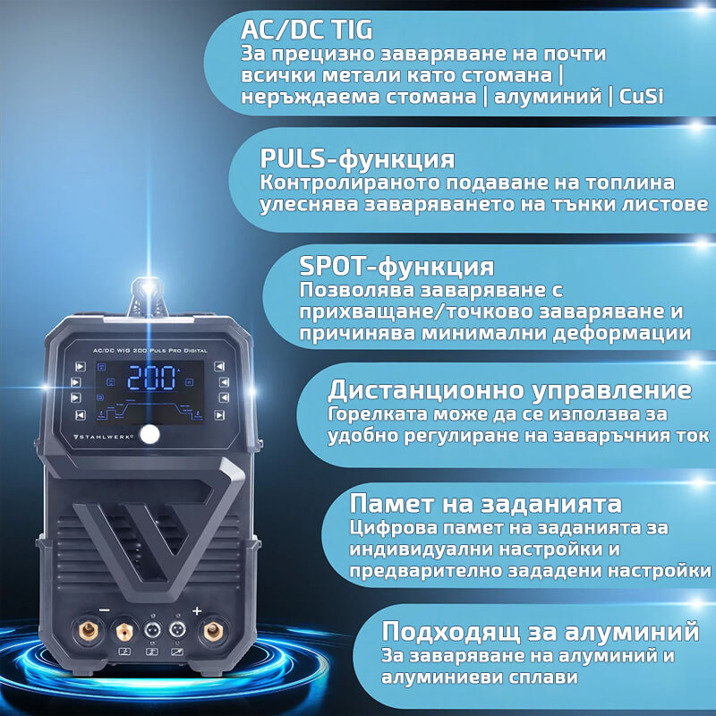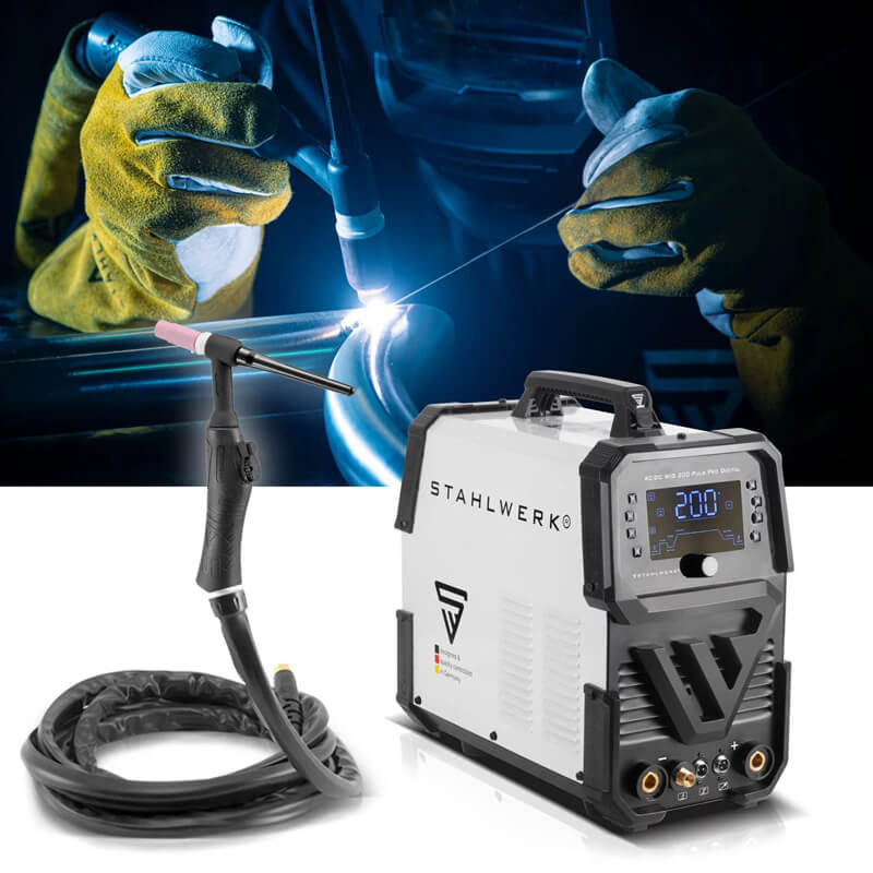 STAHLWERK AC/DC TIG 200 Puls Pro е многофункционална ВИГ заваръчна машина с функция MMA/ARC за заваряване с електрод, която предлага относително ниско тегло и отлични заваръчни свойства с намалена консумация на енергия благодарение на усъвършенстваната широчинно-импулсна модулация (PWM) и най-новите IGBT технология.
