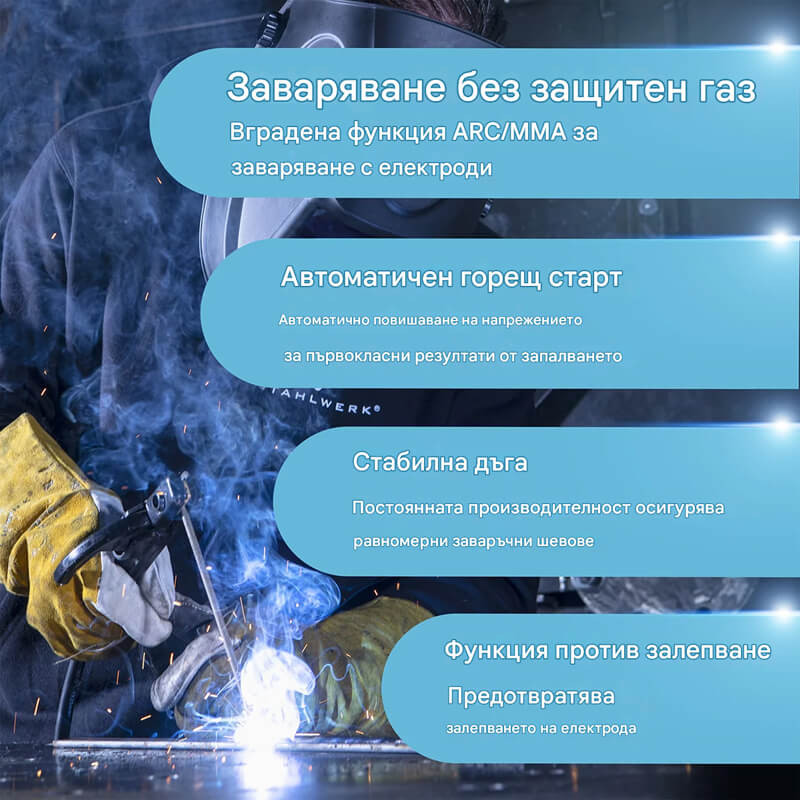 - Анти-залепване (MMA). Ако електродът залепне за детайла, заваръчният ток се намалява автоматично. Електродът не изгаря и може лесно да се отдели от детайла.
