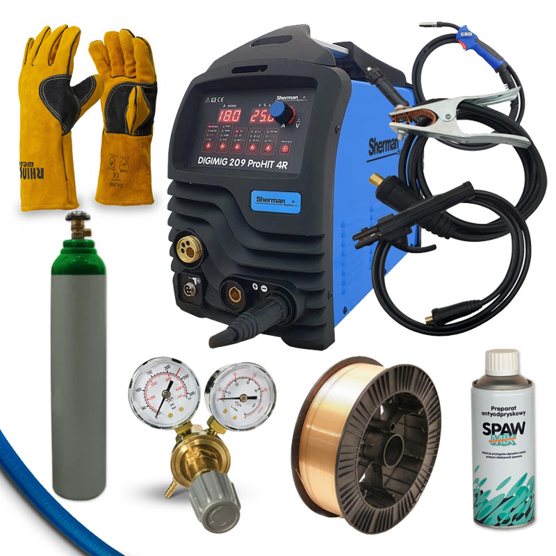 Със Стартовия Комбо продукт за заварчици със Сингергичен инверторен заваръчен апарат Sherman DIGIMIG 209 ProHIT 4R може да започнете работа веднага без да е необходимо да закупувате допълнително консумативи.