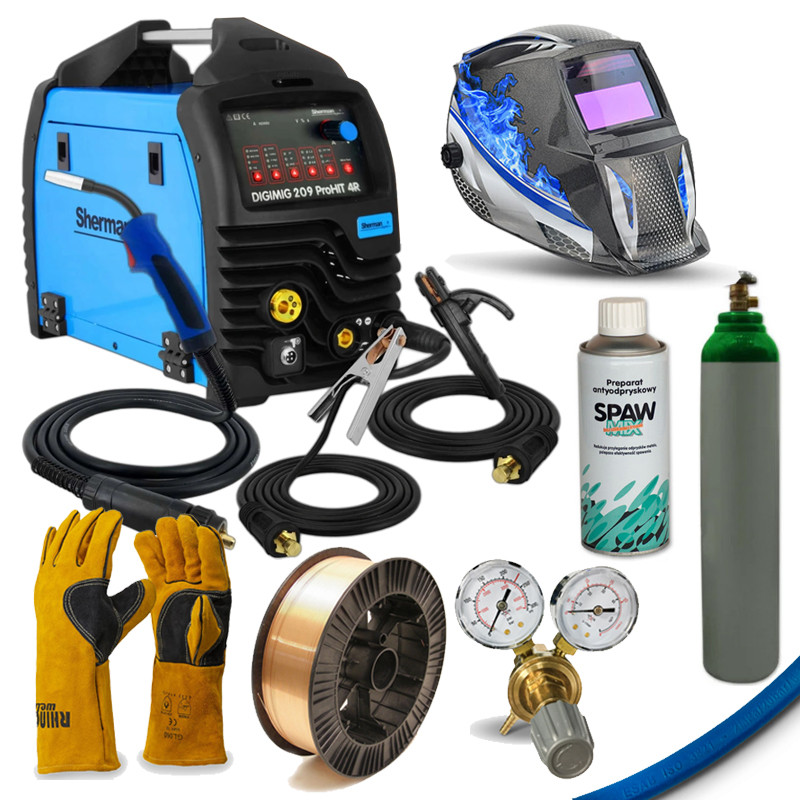 Със Стартовия Комбо продукт за заварчици със Сингергичен инверторен заваръчен апарат Sherman DIGIMIG 209 ProHIT 4R може да започнете работа веднага без да е необходимо да закупувате допълнително консумативи.