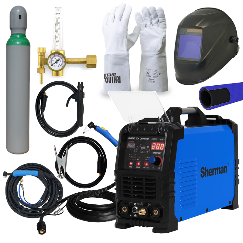 Стартовият Комбо продукт за заварчици със Заваръчен апарат Sherman DIGITIG 204 QUATTRO с плазмен бренер включва: