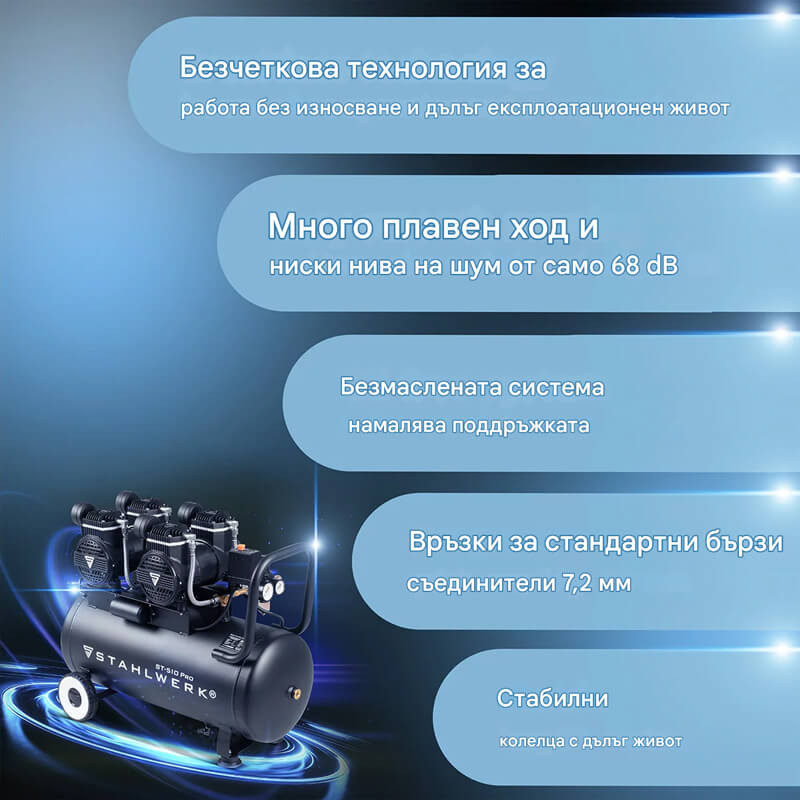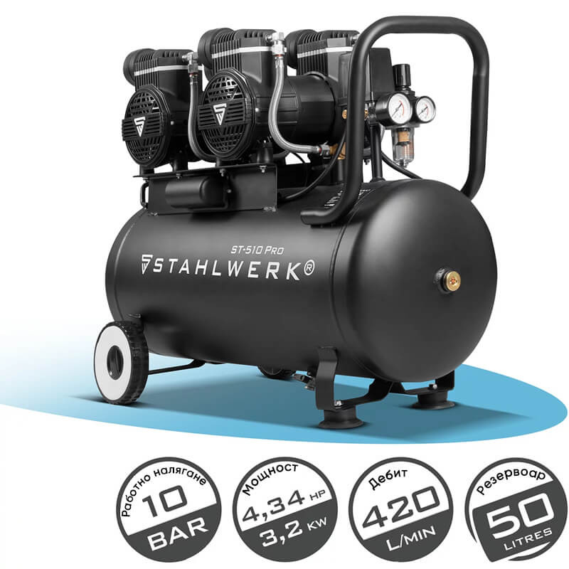 Тихият компресор за сгъстен въздух ST 510 Pro на STAHLWERK има резервоар от 50 L и изходно налягане от 10 бара.