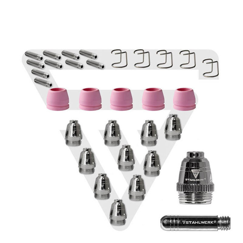 Този комплект аксесоари за плазма се състои от 10 плазмени дюзи, 10 електрода, 5 разделителя и 5 керамични капачки. Висококачествени плазмени аксесоари за вашата работа по рязане. Особено подходящ за всички плазмени горелки P-60. Повишена производителност и надеждност на вашата горелка благодарение на първокласни износващи се части. Перфектното подравняване на електрода и режещата дюза позволява монтаж без монтажни инструменти.