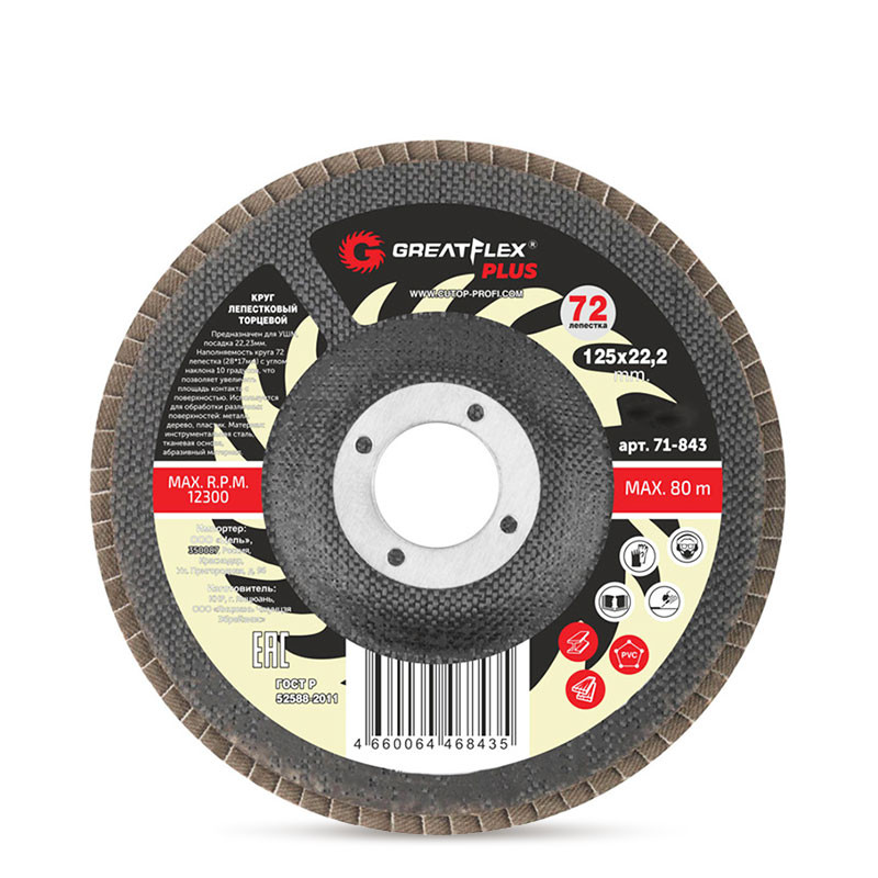 Абразивният материал е представен под формата на 72 венчелистчета (28*17 мм) с ъгъл на наклон 10 градуса, което ви позволява да увеличите контактната площ с повърхността.