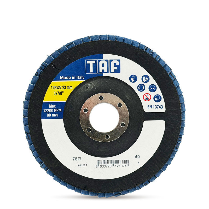 Висококачествен ламелен диск TAF 78ZI с полипамучен плат и едноклапна конструкция, осигуряваща равномерно износване и дълъг живот. Изработен от циркониев оксид, подходящ за ефективна обработка на въглеродна стомана. Фибростъклената подложка гарантира стабилност при работа и устойчивост на високи обороти. Идеален за шлайфане, зачистване и дооформяне на метални повърхности.