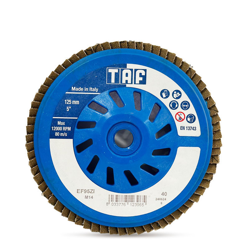Ламелният диск с циркониев оксид на TAF EF95ZI е с полипамучен плат и едноклапна конструкция, осигуряваща стабилна и равномерна работа. Подходящ за приложения върху неръждаема и въглеродна стомана. Оборудван с вентилирана пластмасова основа за по-добро охлаждане и по-ниско тегло. Резбата M14 позволява бърза и лесна смяна на диска без допълнителен фланец. Идеален за шлайфане, зачистване и довършителни операции при метални конструкции.