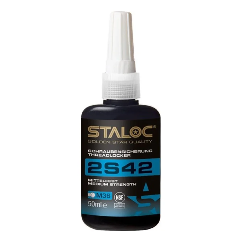 STALOC 2S42 е синьо анаеробно лепило със средна якост за закрепване и уплътняване на резбови съединения, които ще се демонтират с инструменти. За употреба върху леко омаслени повърхности. Предлага повишена устойчивост на корозия, вибрации, вода, газове, различни масла, въглеводороди и много други химикали. Отлична температурна устойчивост от -55°C до +200°C. Осигурява краткосрочно уплътняване при температури до 250°C.