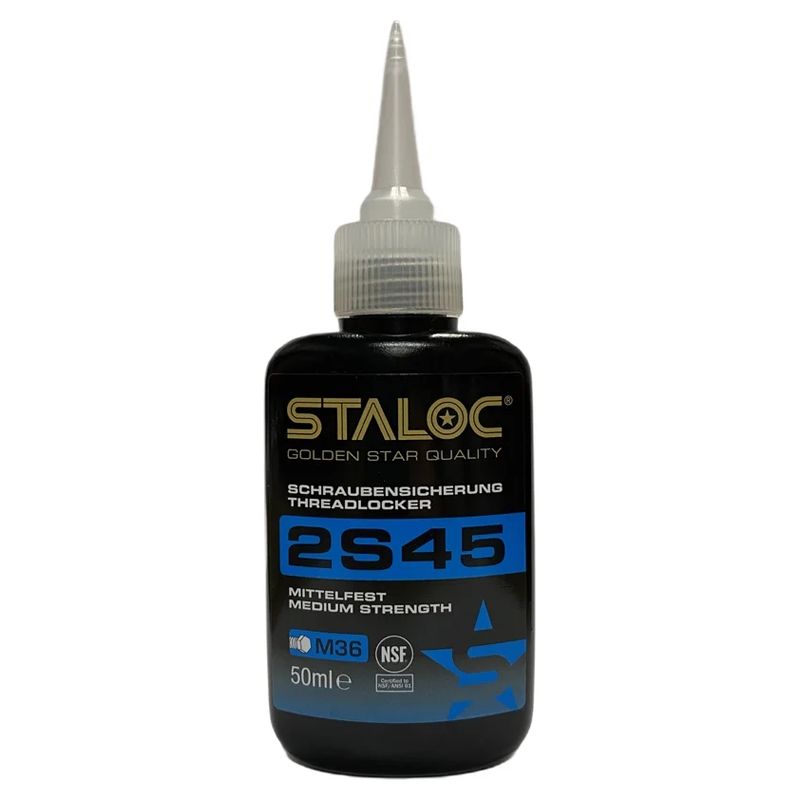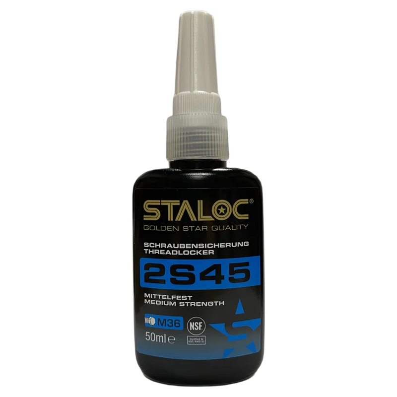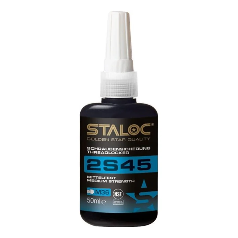STALOC 2S45 е синьо анаеробно лепило със средна якост за закрепване и уплътняване на метални резбови съединения, които ще бъдат демонтирани по-късно. То предлага повишена устойчивост на корозия, вода, газове, различни масла, въглеводороди и много други химикали. Заменя PTFE лентите за уплътняване срещу газ, втечнен нефтен газ, сгъстен въздух, масло, бензин, питейна вода и различни химикали. Високият му вискозитет предотвратява оттичането на резбата до пълното ѝ втвърдяване. Предлага повишена устойчивост на удар и вибрации.