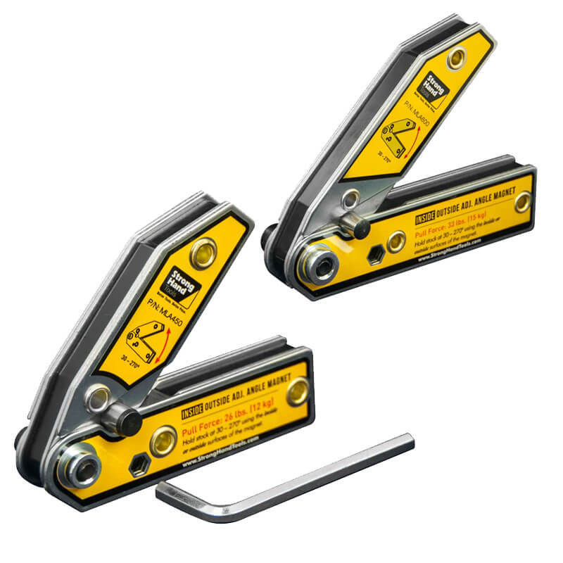 Регулируем ъглов магнит на STRONGHAND със задържаща сила от 12 или 15 кг. Магнитите с вътрешен/външен ъгъл са изградени от два независими правоъгълни магнита за постоянна, ненамаляваща магнитна сила, когато двете страни са прикрепени към детайлите.