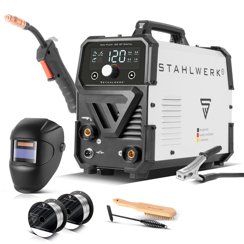 Универсално приложимият заваръчен апарат на STAHLWERK, Mini FLUX 120 ST Digital, работи с мощност до 120 ампера. Заваръчният инвертор е подходящ за заваряване с флюсова тел FLUX без защитен газ, както и за приложения Lift TIG и MMA/ARC.