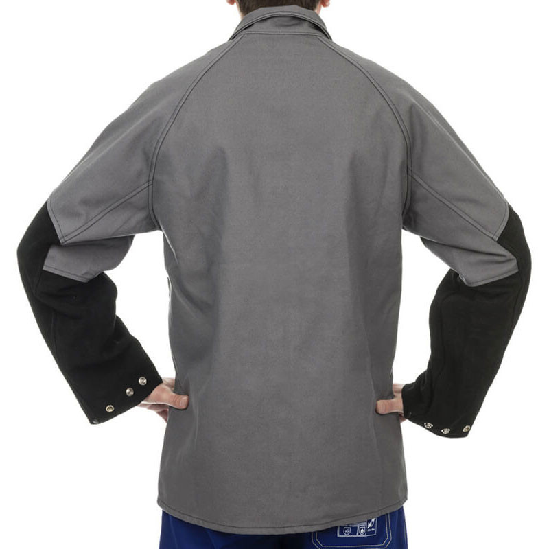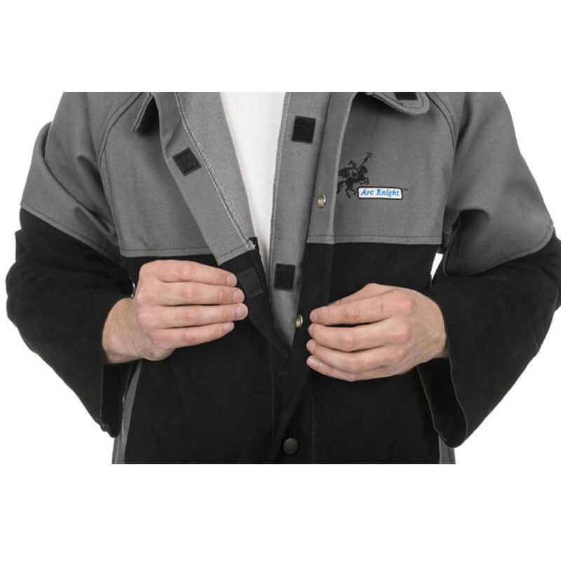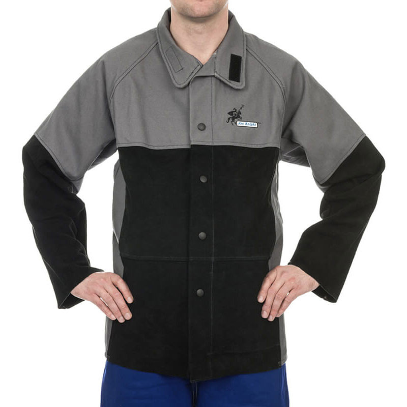 Тази гама якета за заваряване Arc Knight на WELDAS са много удобни за носене, като същевременно осигуряват защитата, необходима за повечето ситуации на заваряване. Горната част на якето, подлакътниците и гърбът са изработени от тежък искроустойчив памук (520 g/m 2 ), докато долната предна част на якето и предмишниците са от цепена телешка кожа, осигуряваща защитата, където е необходима, без тежестта на пълно кожено яке за заваряване.