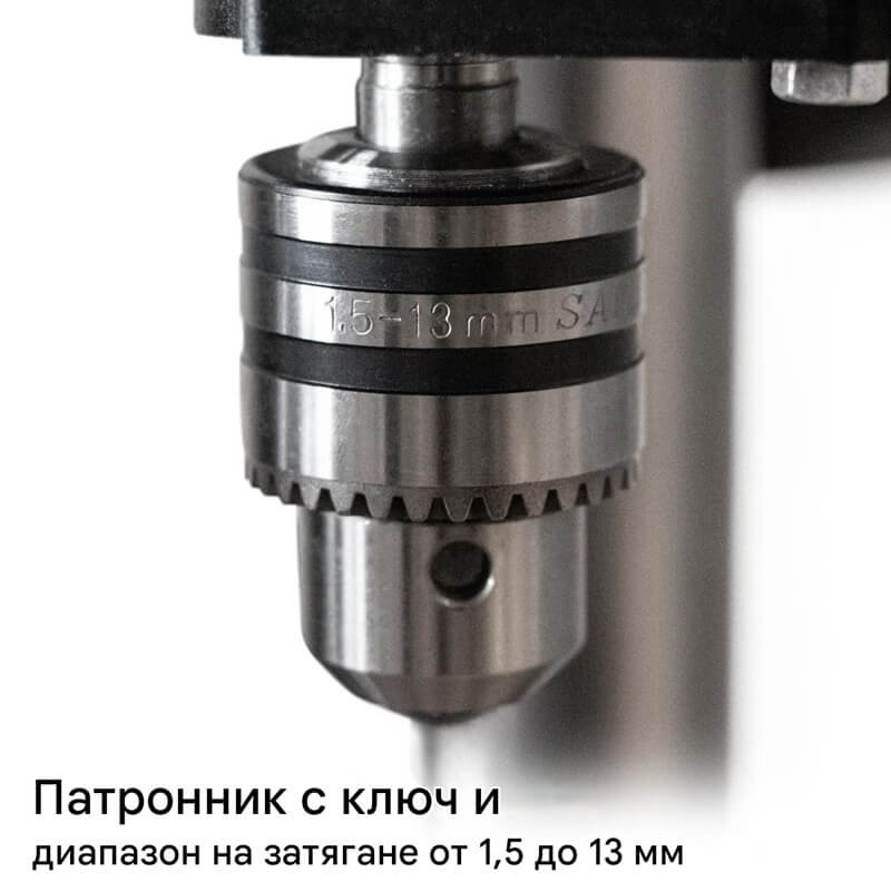 Колонната бормашина STAHLWERK BD-350 ST е компактна и мощна настолна бормашина, подходяща за металообработване и моделиране, както и за взискателни ентусиасти „Направи си сам“. С мощност от 350 вата и диаметър на пробиване до 13 мм, колонната бормашина позволява прецизно пробиване в дърво, метал и пластмаса. Шпинделът на бормашината, монтиран на сачмени лагери, осигурява плавен ход и стабилност. Масата за пробиване е безстепенно регулируема по височина и може да се накланя и завърта. Бормашината има сгъваем предпазител против стружки и здрава метална основа за безопасна работа. Зъбчатият патронник с диапазон на затягане от 1,5 до 13 мм държи инструментите здраво на място. Скоростта на бормашината може да се регулира от 620 до 2620 об/мин чрез ремъчни шайби. Трираменният, странично монтиран лост за подаване позволява оптимален контрол на налягането и бързо обезвъздушаване на отвора по време на охлаждане. Лесно регулируем ограничител на дълбочината осигурява възпроизводими дълбочини на пробиване.