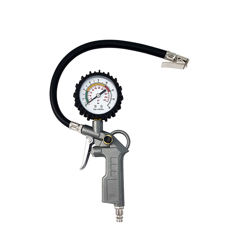 Помпичка за гуми с манометър за бърз конектор R26 със скоба и освобождаващ вентил. Присъединителна резба 1/4″. Дължина на маркуча 30 см.
