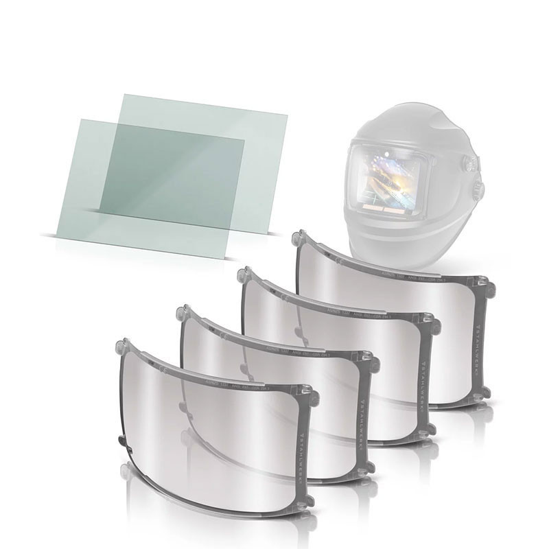 Комплектът сменяеми слюди за заваръчна каска се състои от четири прозрачни външни слюди за визьора и две вътрешни защитни слюди - подходящи за напълно автоматичните заваръчни маски STAHLWERK RAPTOR.