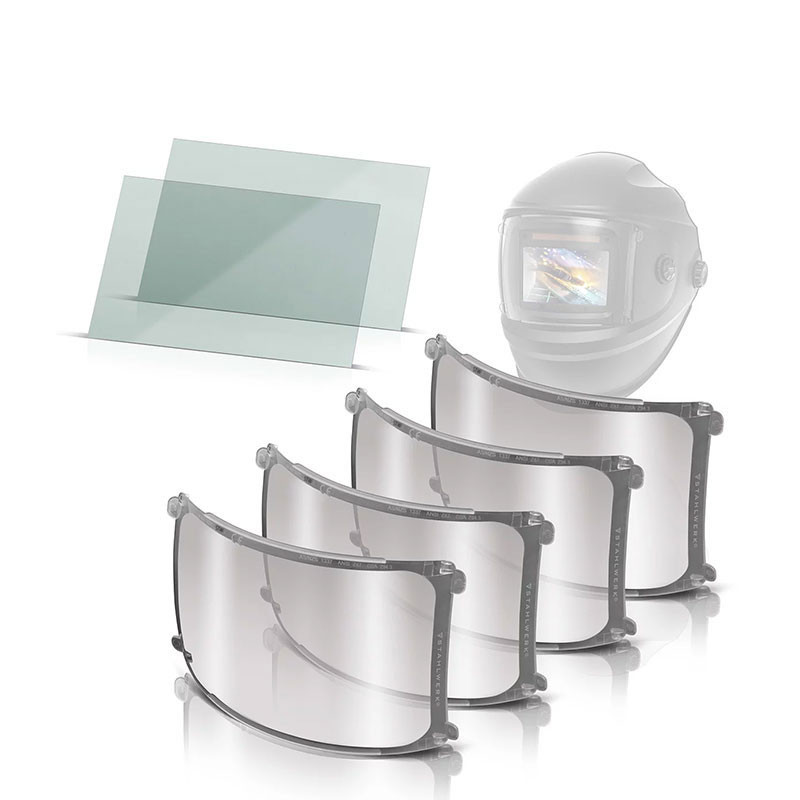 Комплектът сменяеми слюди за заваръчна каска се състои от четири прозрачни външни слюди за визьора и две вътрешни защитни слюди - подходящи за напълно автоматичната заваръчна маска STAHLWERK BULLET.