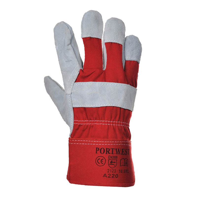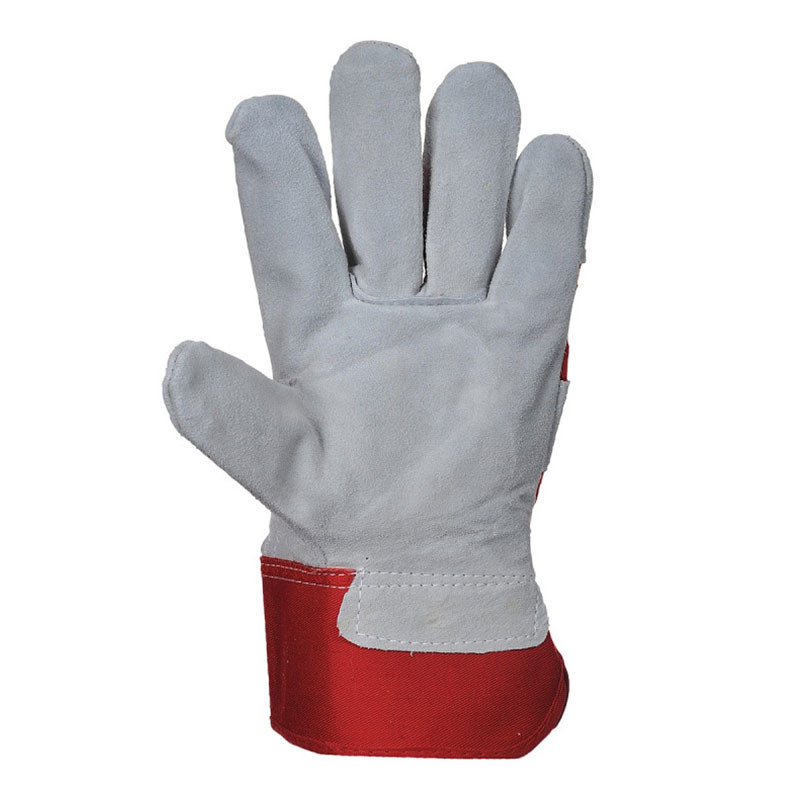 Превъзходно качество сива цепена кожа с червен памучен гръб и кожена платка за защита на кокалчетата. Гумиран предпазен маншет. За използване в строителството, минното дело, озеленяване и др.