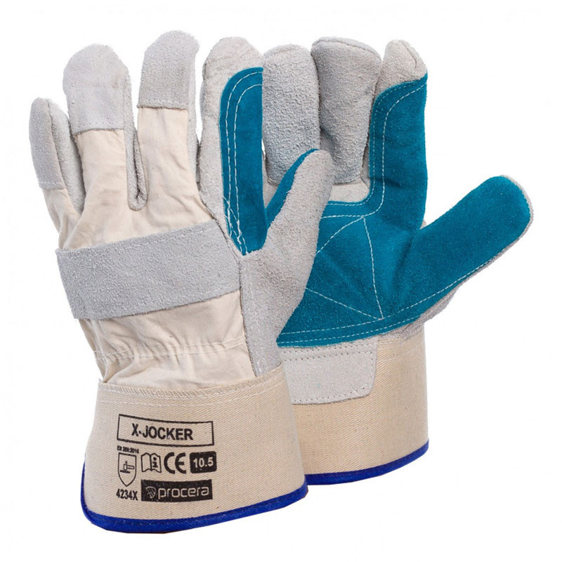 Предпазните ръкавици с телешка кожа X-JOCKER са изработени в горната част от памучен плат. Захващащата част е изработена от висококачествена телешка кожа в естествен цвят. В захващащата част, както и върху палеца и показалеца, е използвано допълнително подсилване от слой синя телешка кожа.