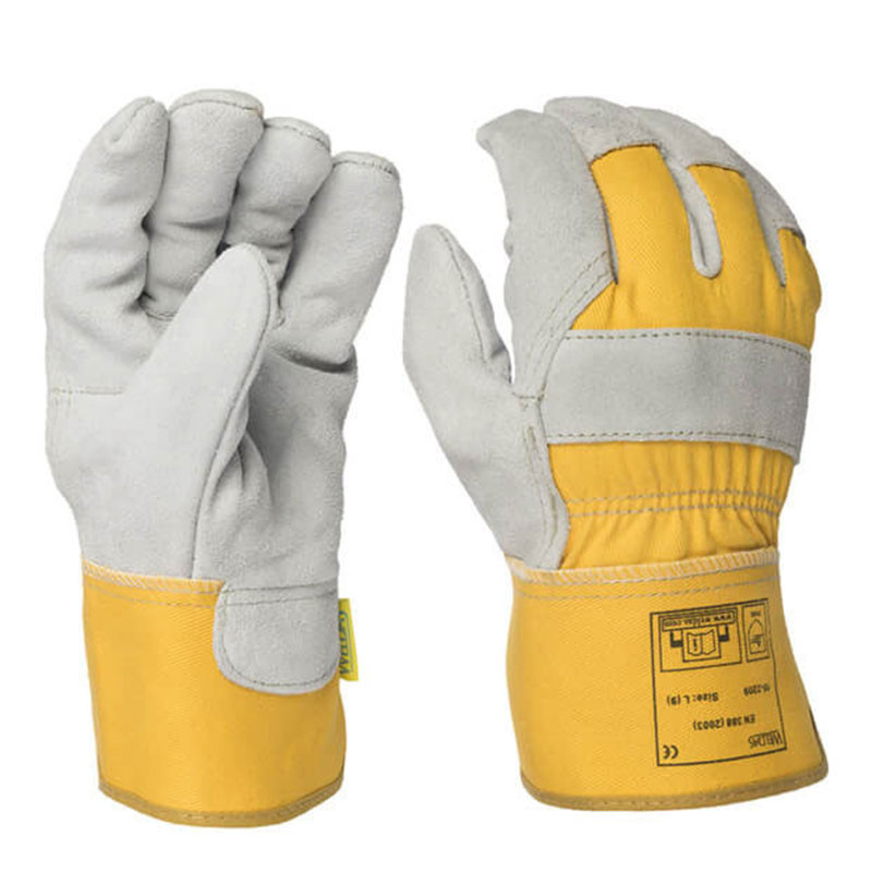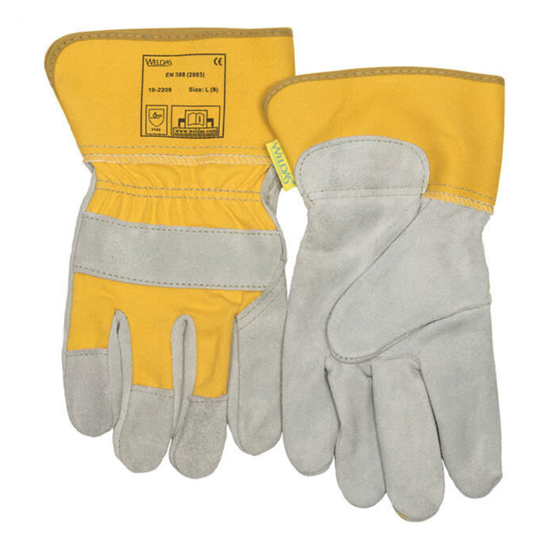 Weldas защитни цветни работни ръкавици 10-2209 с каишка за кокалчетата от цепена телешка кожа, подплата в дланта и 7.5 см предпазен маншет