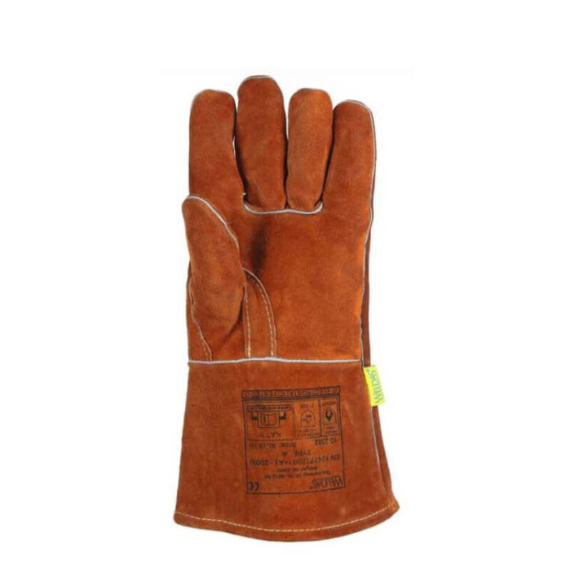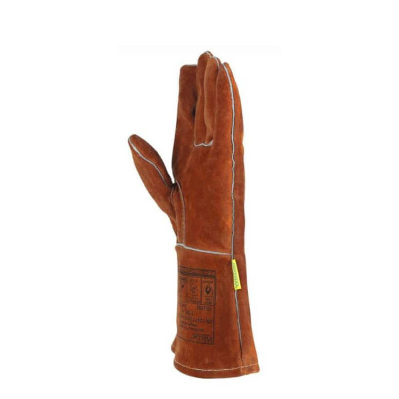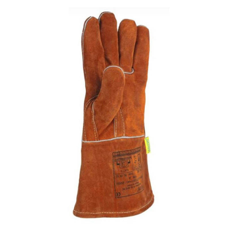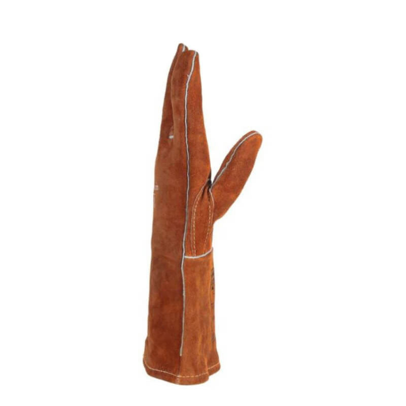 Лява заваръчна ръкавица с прав и подсилен палец за по-добро боравене с шлангове MIG, изработени от цепена телешка кожа.