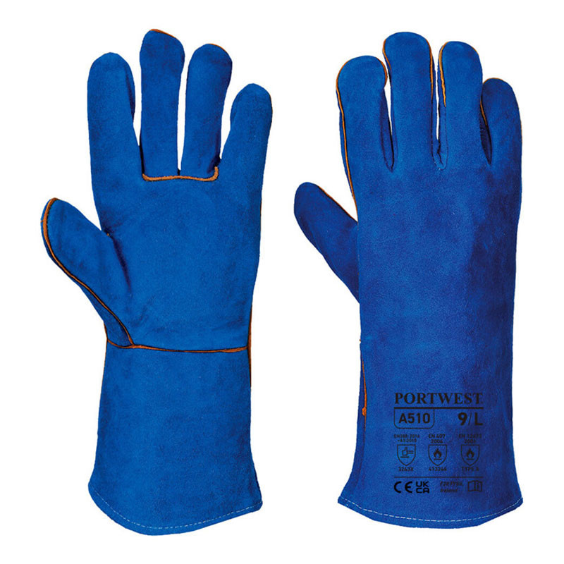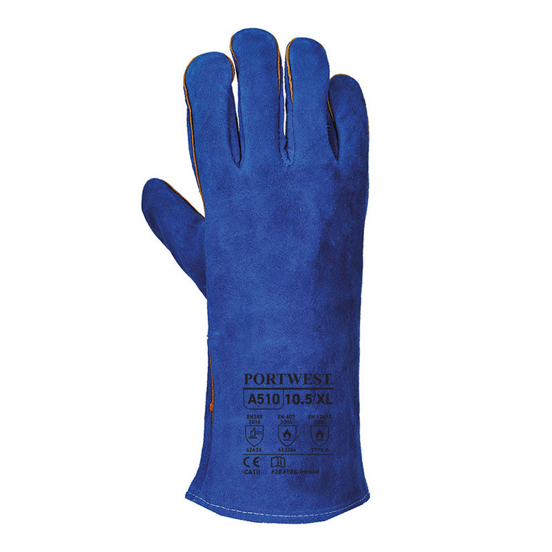 Ръкавици за заварчици от цепена телешка кожа, гръб от една част, 14" дължина на маншета, изцяло подплатени с памучна подплата.