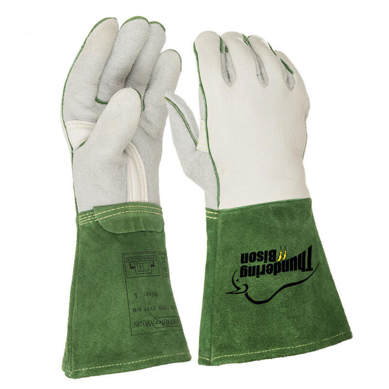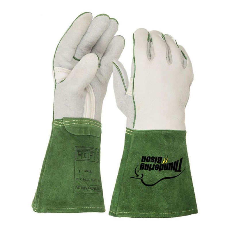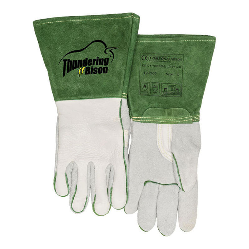 Ръкавици за заваряване ThunderingBison ™ с подсилена длан от бизонова кожа, маншет от цепена телешка кожа и гръб с подплата COMFOflex ®, предлагащи отлична чувствителност и гъвкавост, отлична механична устойчивост на абразия, тройно зашити Kevlar® шевове, много добра устойчивост на пробиване, подсилен палец.