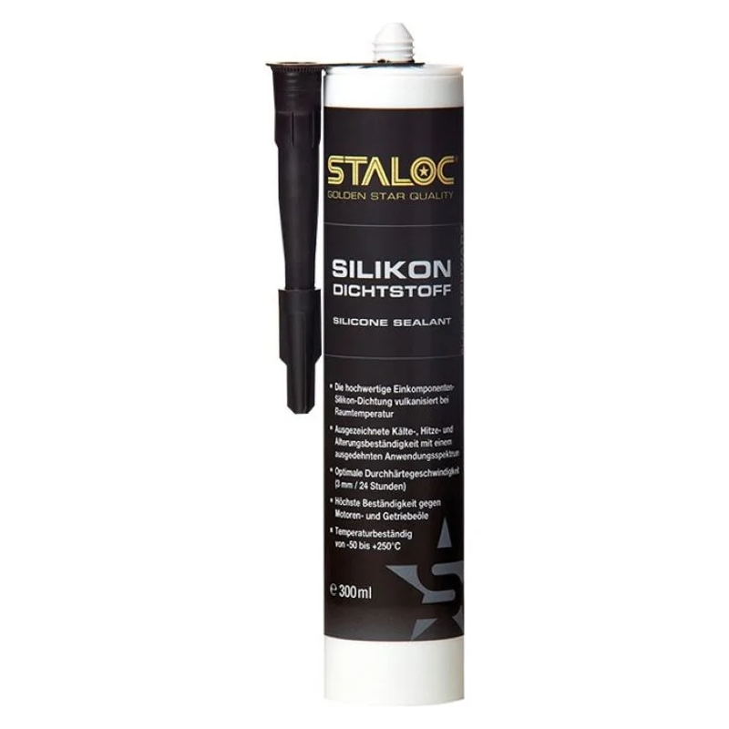 Черният силиконов уплътнител STALOC е маслоустойчив, еднокомпонентен уплътнител, който се втвърдява при стайна температура до силиконов каучук. Той поддържа еластичност и има отлична адхезия, което му позволява да издържа на различни динамични натоварвания, като удар и вибрации.