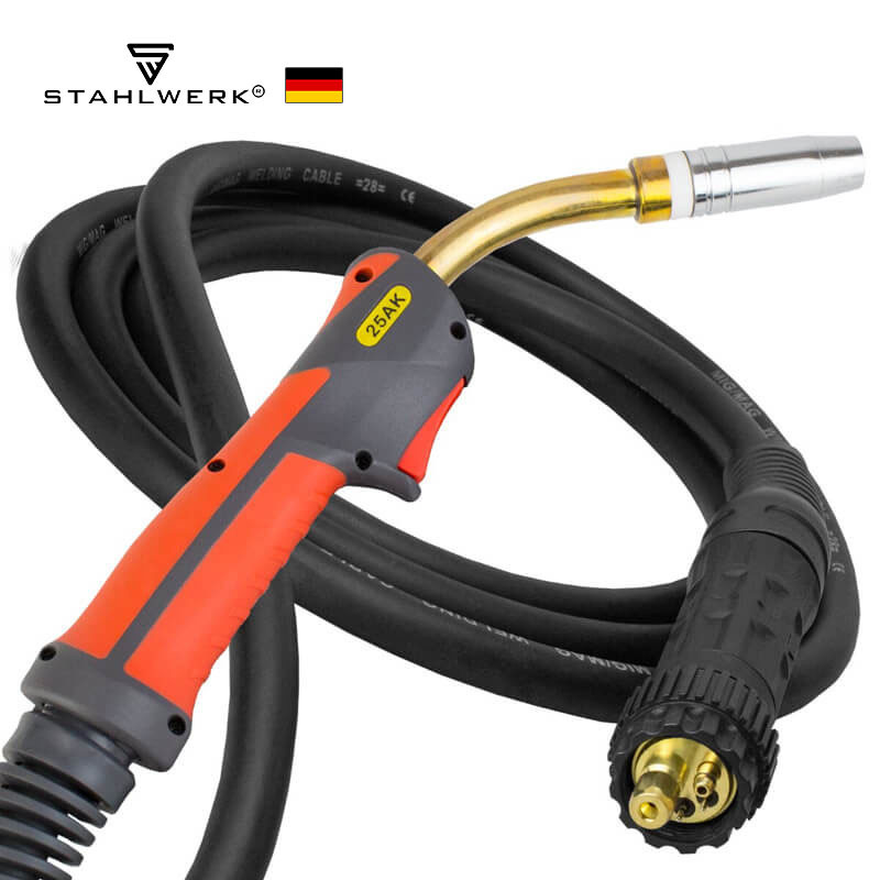Заваръчните шлангове MIG/MAG на STAHLWERK са със здрав дизайн и перфектно съвпадат със заваръчното оборудване на STAHLWERK и с това на други производители.