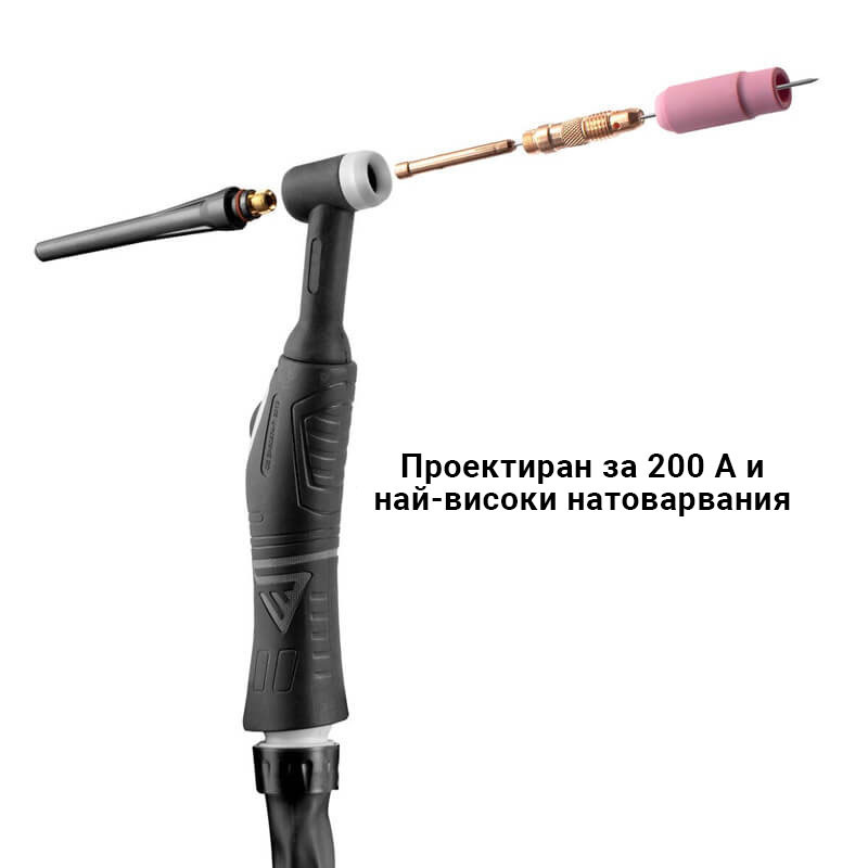 Висококачественият TIG шланг превръща всички MIG/MAG устройства в мощен TIG заваръчен апарат с Lift-TIG запалване с четка. Висококачественият шланг е проектиран за максимум 200 ампера, има здрав дизайн и може да издържи на най-високи натоварвания. Снабден с гъвкава глава, заваръчният шланг WP26F на STAHLWERK позволява удобно заваряване дори на труднодостъпни места.