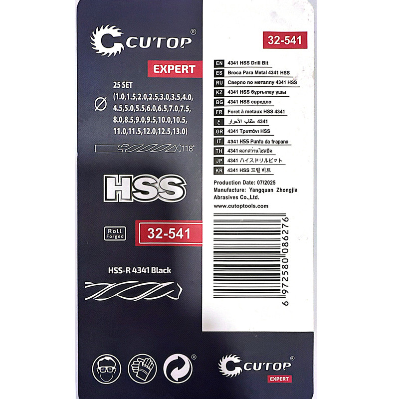 Професионалният комплект HSS-G свредла Cutop Profi включва 25 висококачествени спирални свредла, които покриват диапазона от 1 мм до 13 мм с размери през 0.5 мм, предлагащ пълен набор за пробиване на отвори с различни диаметри.