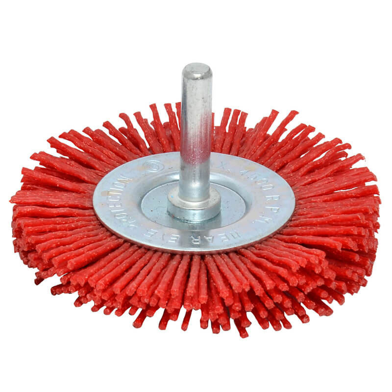 Плоска четка за бормашина с щифт, найлон, зърненост P80. Това е специален вид аксесоар за електрически инструменти, предназначен за работа с меки, деликатни материали. Използва се за оголване и шлайфане на меко дърво и някои метали (алуминий, мед и др.). Отстранява различни замърсители, ръжда и неравности от повърхността.