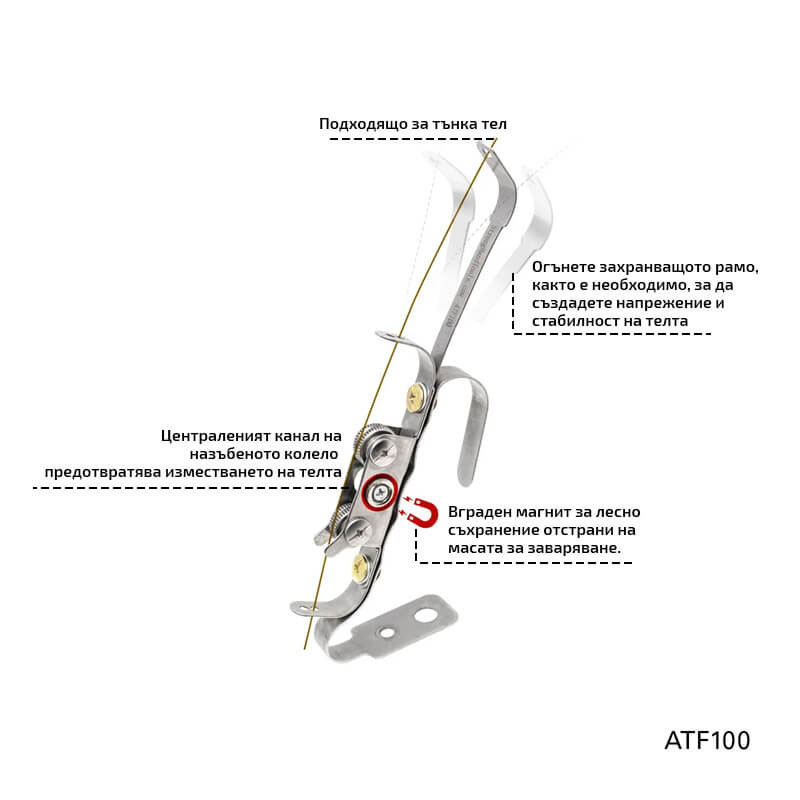 ATF100 лежи сигурно и удобно в ръката, позволявайки стабилно подаване дори с ръкавици. Раменете могат да се огъват, за да се добави напрежение и стабилност на телта, а централните жлебове в колелцата предотвратяват изместването дори на най-тънката тел.