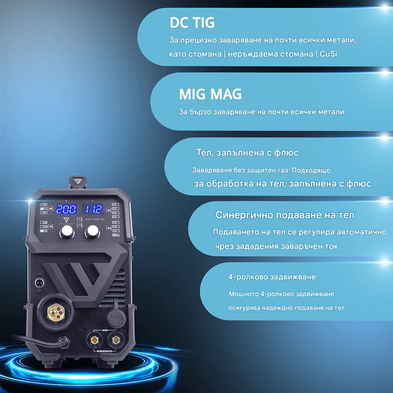 Комбинираният заваръчен апарат STAHLWERK MTM-200 ST е мощен 3-в-1 инверторен апарат с изходна мощност 200 A. Той комбинира TIG (DC), MIG/MAG и MMA заваръчни процеси в едно компактно устройство. Подходящ е и за заваряване с тръбна тел (FLUX) и за прецизна работа върху тънки листове метал. Не е възможно обаче да се заварява алуминий. В режим MIG/MAG и FLUX, автоматичното подаване на телта с избираеми диаметри на телта (0,6/0,8/1,0 мм и 0,9 мм за тръбна тел) позволява удобно заваряване. Дорникът за макари е подходящ за захващане на макари с диаметър 16 мм или 50 мм, така че да могат да се затягат макари с тел от 1 до 5 кг. Мощно 4-ролково задвижване осигурява надеждно и непрекъснато подаване на телта, дори при по-дебели заваръчни телове. Безстепенната корекция на напрежението и регулируемата корекция на ширината на дъгата осигуряват допълнителен контрол върху проникването, формата на шева и скоростта на изгаряне на телта. В TIG режим, MTM-200 ST работи с постоянен ток (DC) и високочестотно запалване (HF). Режимът 2T/4T, както и регулируемите параметри за увеличаване на тока, намаляване на тока, подаване на газ и забавяне на газа, позволяват много контролирано запалване и завършване на шева. За MMA режим са налични 20-180 A, допълнени от горещ старт за по-лесно запалване и антизалепващо покритие, предотвратяващо залепването на електрода. Съвременната IGBT инверторна технология осигурява висока производителност с компактен дизайн и ниско тегло. Защитата от прегряване, мощното интелигентно охлаждане, корпусът ST-Guard и функцията VRD (работа на празен ход с намалено напрежение в MMA режим) повишават безопасността и надеждността, дори при интензивна употреба в работилницата. Това прави MTM-200 ST универсален уред за професионални приложения в занаята и за взискателни „Направи си сам“ ентусиасти.