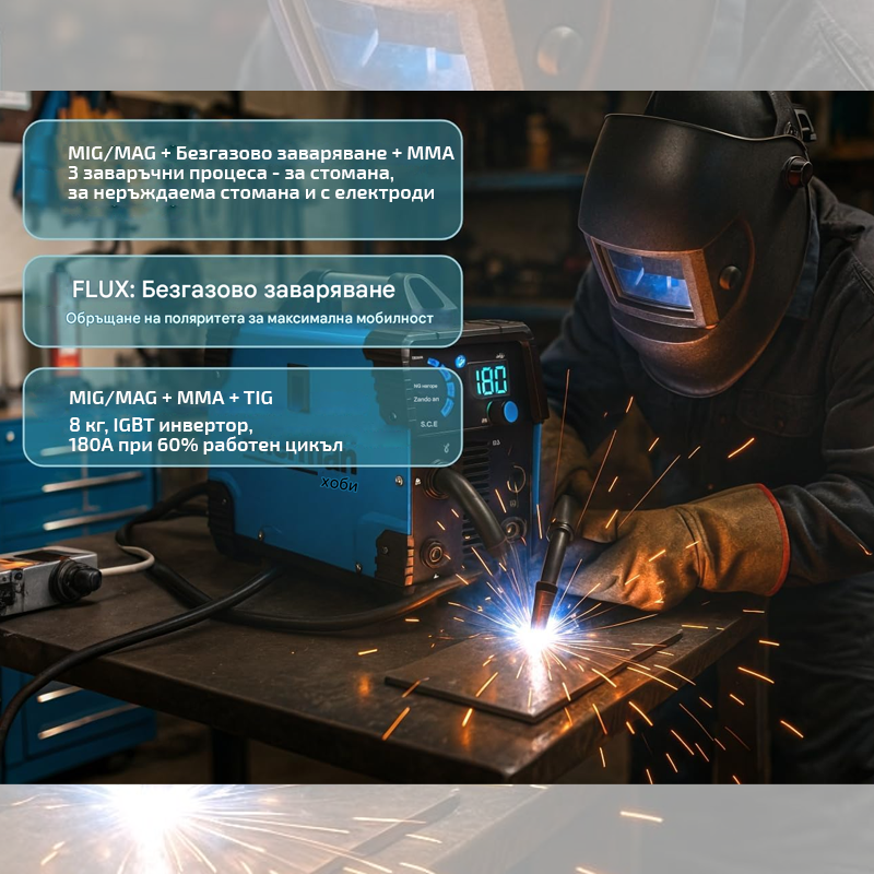 IGBT инвертор, заваръчен ток 180A (60%), AC 230V 50Hz захранване, MIG, TIG, MMA