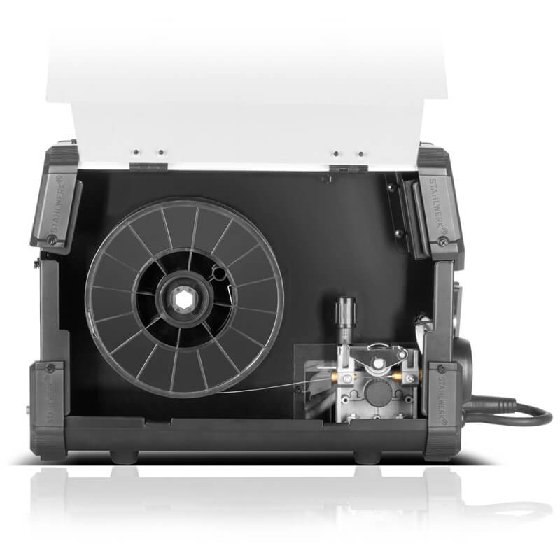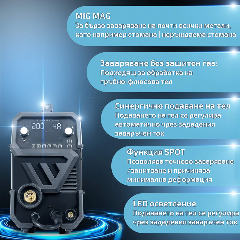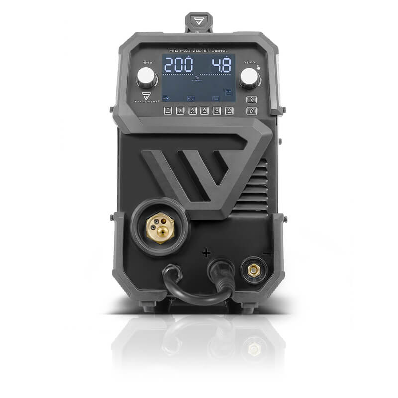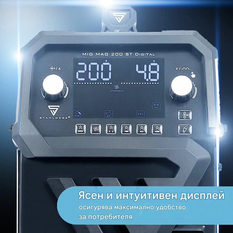 Дигиталният заваръчен апарат STAHLWERK MIG MAG 200 ST има синергично подаване на тел, работи с до 200 A и е подходящ както за MIG MAG заваряване, така и за MMA/ARC приложения. Освен това може да се обработва с флюсова тел, така че е възможно заваряване без защитен газ. Параметрите на заваряване могат лесно да се отчитат на ясен цифров дисплей. Различните режими могат да се настройват бързо с помощта на интуитивно меню. Оборудван с най-новото поколение IGBT технология, инверторът предлага изключителни заваръчни свойства благодарение на по-високата си ефективност и намалената консумация на енергия. Благодарение на оптималните параметри на производителност, универсалните заваръчни апарати могат да се използват за почти всички изисквания и винаги осигуряват перфектни работни резултати. В допълнение към интелигентното охлаждане с вградена защита от прегряване, заваръчният апарат има синергично подаване на тел. Скоростта на подаване на телта се регулира автоматично от зададения заваръчен ток. Като специален акцент, заваръчният апарат има вградена LED светлина за осветяване на водача на телта, което позволява бърза смяна на макарата с тел дори при условия на лоша видимост. Тя се включва автоматично при отваряне на защитния капак. Компактният дизайн и ниското тегло осигуряват лесно транспортиране и комфортна работа. Функцията за точково заваряване е особено подходяща за тънки части на каросерията в автомобилния сектор. В резултат на това точките на заваряване са прецизно възпроизводими и равномерни. Функцията за точково заваряване означава, че към детайла се предава много малко топлина, което води до по-малко деформация. Режимът 2T/4T предлага разширен контрол върху потока на тока.