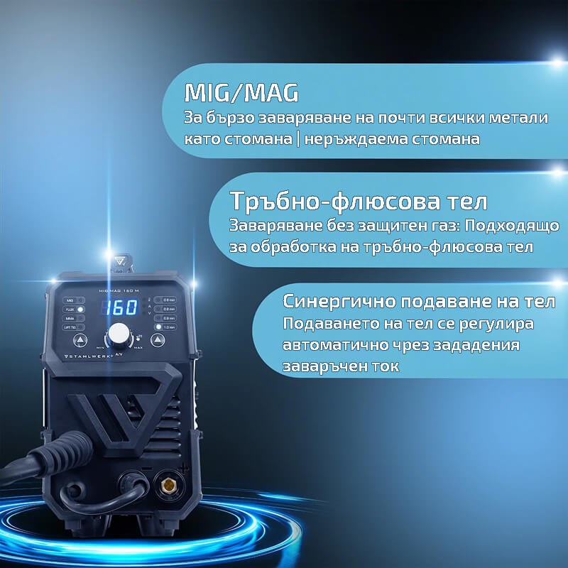 Заваръчният апарат на STAHLWERK MIG/MAG 160 M е компактен, универсален инверторен апарат за всеки, който търси лек, но пълноценен апарат за заваряване с тел с допълнителни функции.