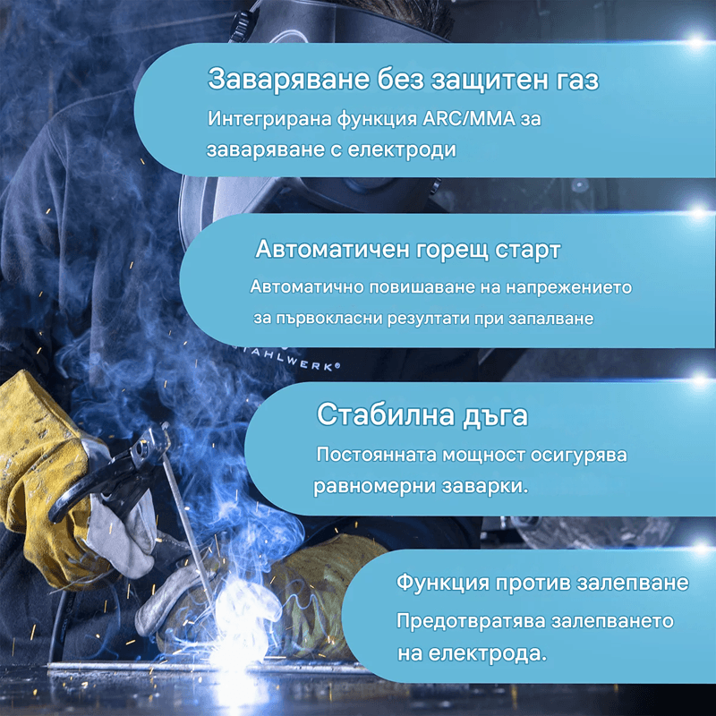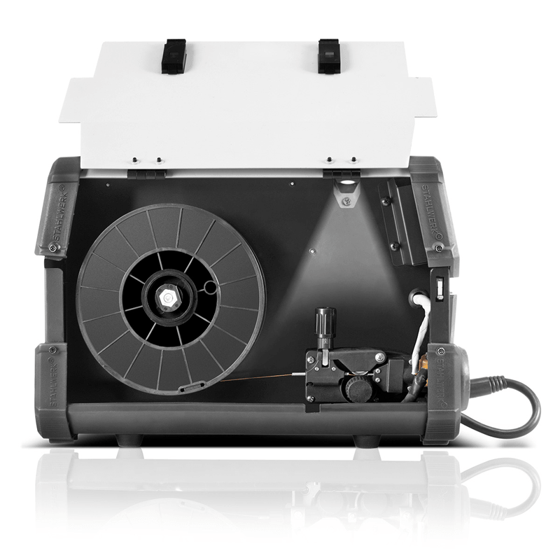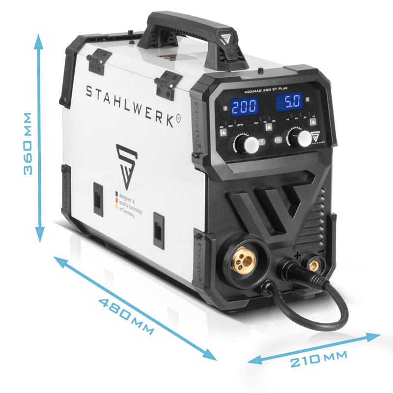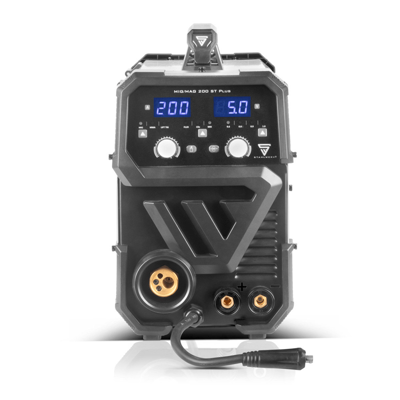 Апаратът за дъгово заваряване със защитен газ на STAHLWERK MIG MAG 200 ST Plus е напълно синергичен, работи с до 200 ампера и е оборудван с най-новото поколение IGBT технология. Комбинираният заваръчен апарат е идеален за MIG MAG заваряване и има функция Lift TIG. Заваръчният апарат е подходящ и за заваряване с електроди и за обработка на флюсова тел. Възможно е и заваряване без защитен газ. В допълнение към интелигентното охлаждане с вградена защита от прегряване, заваръчният апарат има синергично подаване на телта. Скоростта на подаване на телта се регулира автоматично от зададения заваръчен ток. Освен това инверторът регулира параметрите на мощността според зададената в устройството дебелина на телта, което осигурява отлични заваръчни свойства и води до оптимизиран работен резултат. Като специален акцент, заваръчният апарат има вградена LED светлина за осветяване на водача на телта, което позволява бърза смяна на макарата с тел дори при условия на лоша видимост. Тя се включва автоматично при отваряне на защитния капак. Ръчното управление на параметрите на заваряване позволява оптимално адаптиране на заваръчния ток и напрежение към желаната заваръчна задача. Следователно, електродъговият заваръчен апарат е подходящ за прецизно заваряване на тънки листове метал, както и на листове метал и неръждаема стомана. Компактният дизайн на заваръчния апарат и ниското му тегло осигуряват лесно транспортиране и комфортна работа.