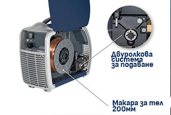 Апаратът използва greenWave® технология за висока енергийна ефективност и прецизен контрол на дъгата във всички фази на заваряване. Вграденото телоподаващо устройство (2 ролки) и синергичните програми (19 предварително зададени) позволяват бърза настройка – операторът избира материал, диаметър на телта и дебелина, а машината автоматично оптимизира параметрите.