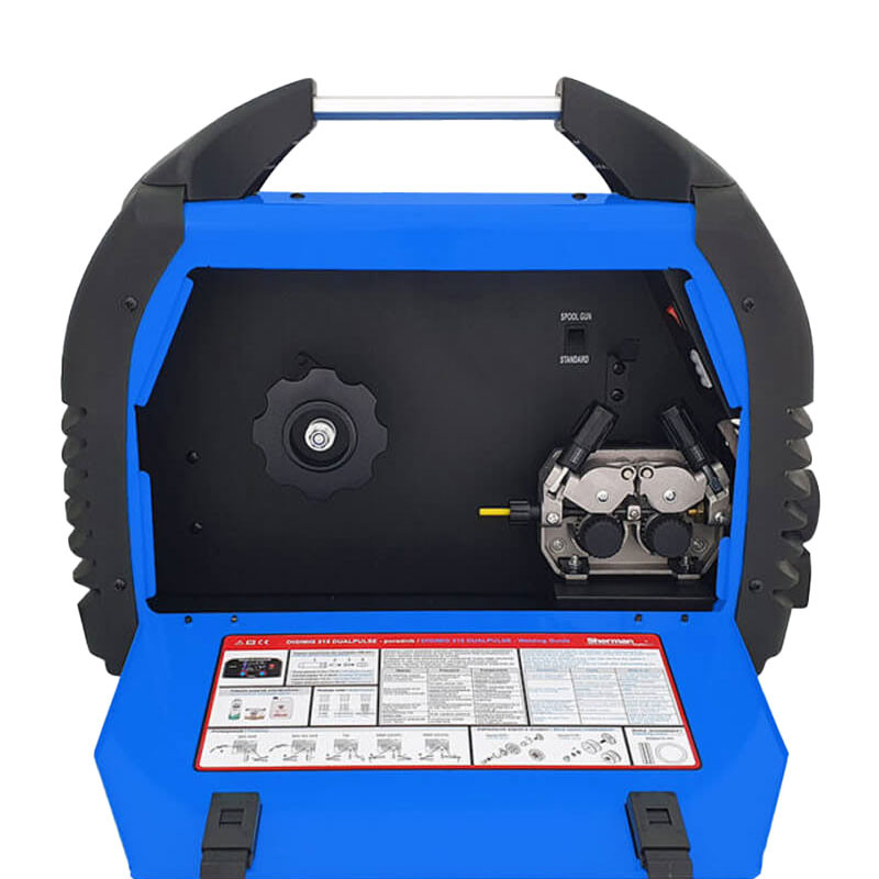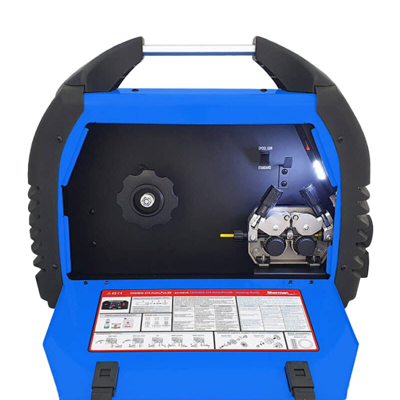 Заваръчният апарат е фабрично конфигуриран за заваряване на алуминий и също така включва стоманена вложка и ролка за заваряване на стомана.