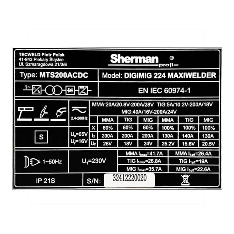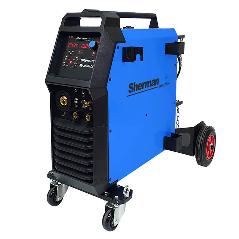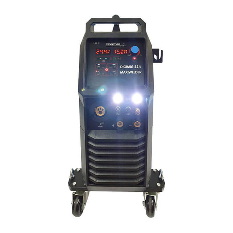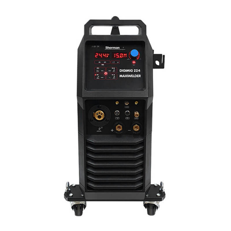 Синергичният заваръчен апарат на Sherman DIGIMIG 224 MAXIWELDER се използва за ръчно заваряване на стомана и цветни метали. Позволява заваряване чрез MMA (покрит електрод), TIG AC , TIG DC и MIG/MAG методи. Регулирането на индуктивността също позволява заваряване на тънки листове. Методът TIG позволява пълна настройка на параметрите на импулса и AC тока, както и избор на формата на AC вълната. Дъгата може да бъде запалена с помощта на йонизатор (HF) или чрез триене (Lift). При заваряване по метода MIG/MAG е възможно ръчно да изберете заваръчни параметри или да използвате синергични настройки, които опростяват работата и позволяват заваръчната машина да се използва от хора с по-малко опит и любители.