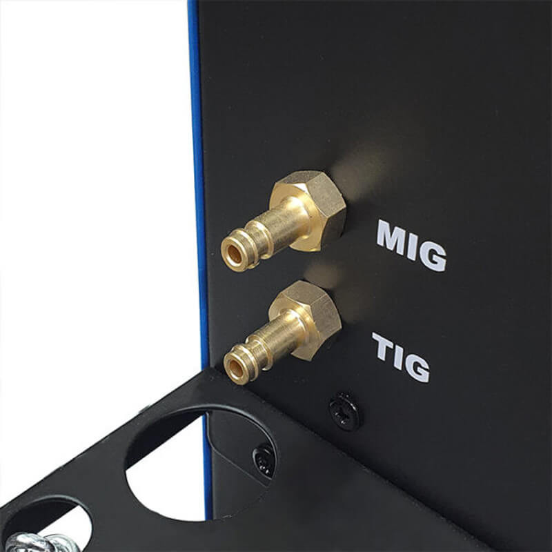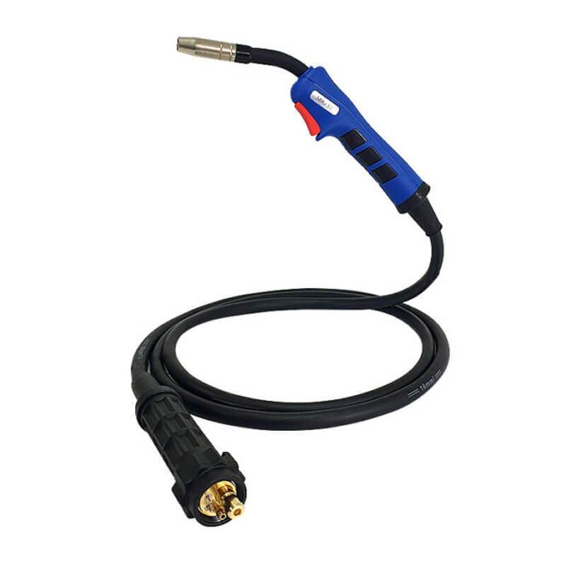 Комплектът включва MIG шланг 4m, TIG шланг с йонизационно запалване, кабел с ръкохватка за електроди, кабел с щипка-маса и магнитен държач за TIG шланга.
